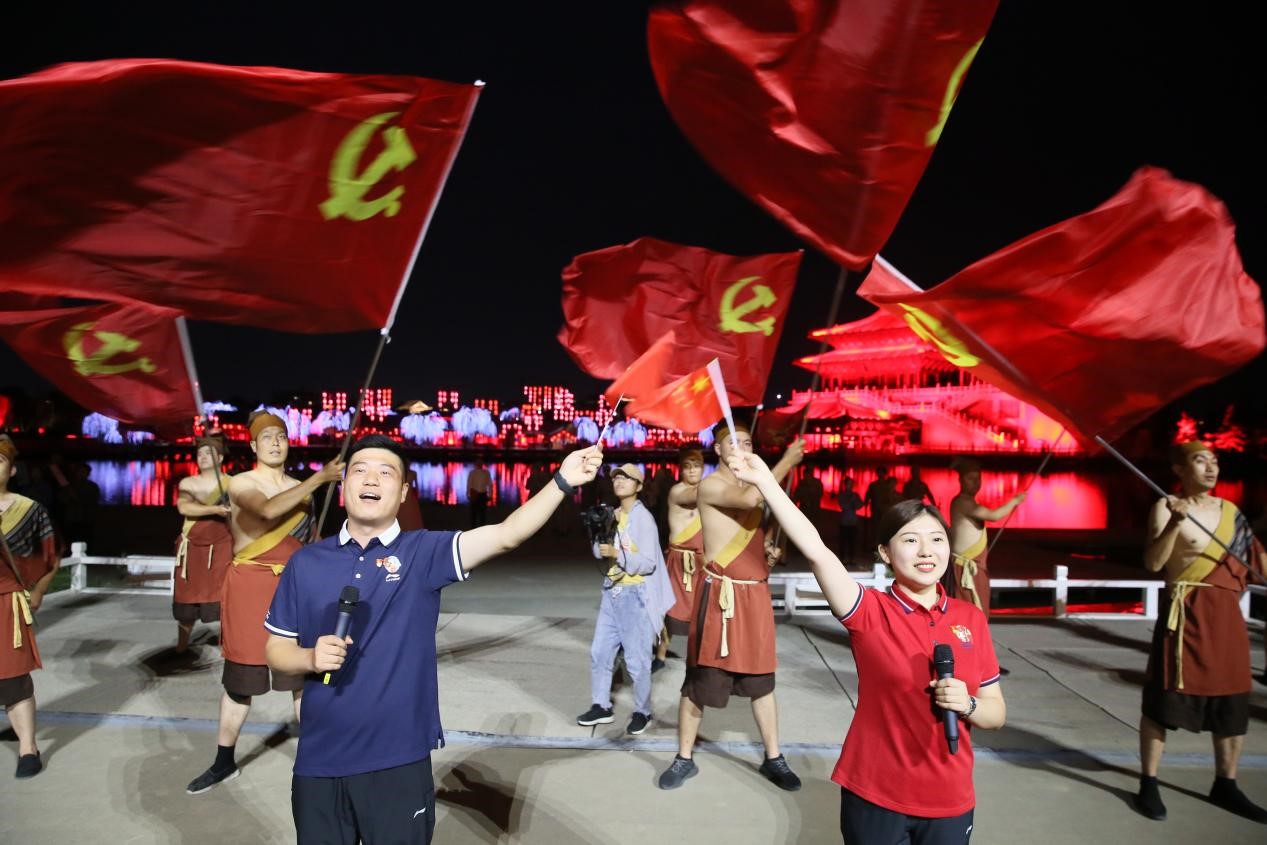 隆重庆祝建党100周年,凝聚和激发全民爱国情怀,清园党支部精心策划,与河南大学戏剧社合作,2021年7月1日晚在景区二期景龙湖畔东京梦华晚会现场开展《百年风华 红心向党》庆祝建党百年主题活动。